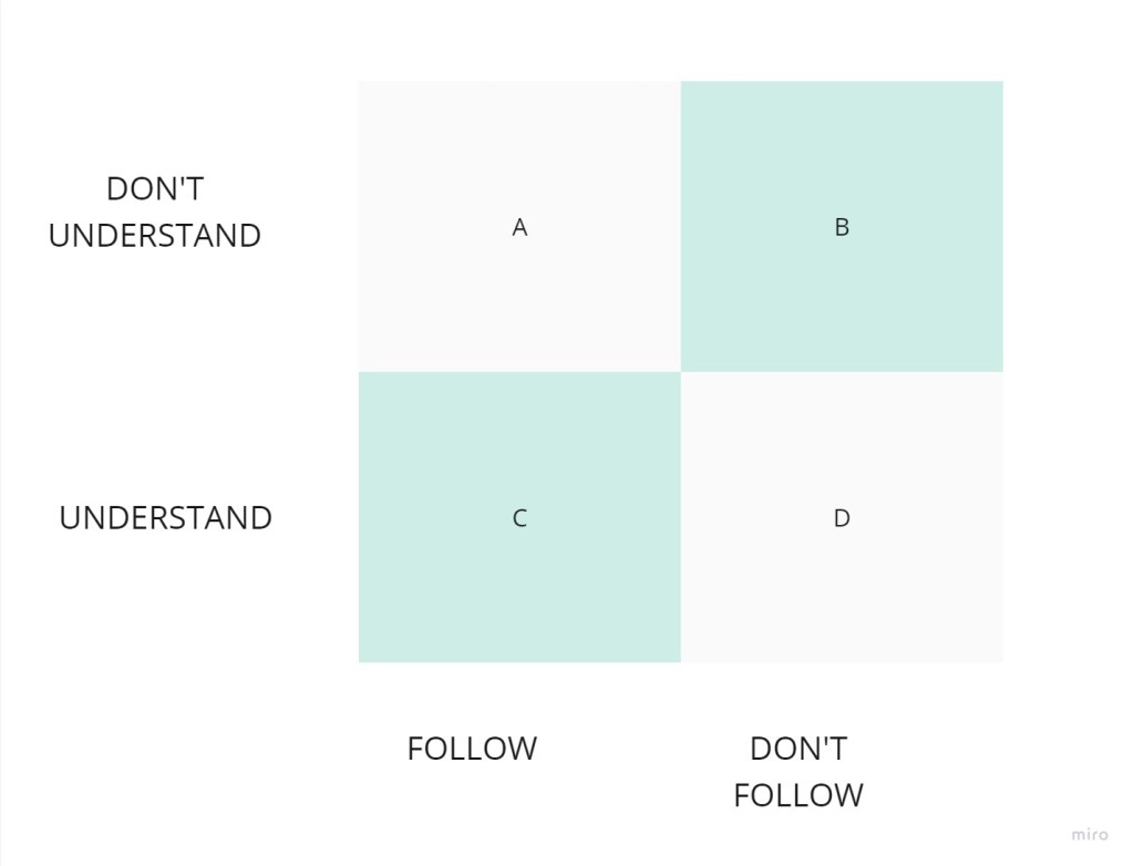 C – Those that understand the importance and therefore follow the guidelines. ‘Therefore’ is an important word here… They follow because they understand, not only because someone told them to. The action comes from their own self-interest.