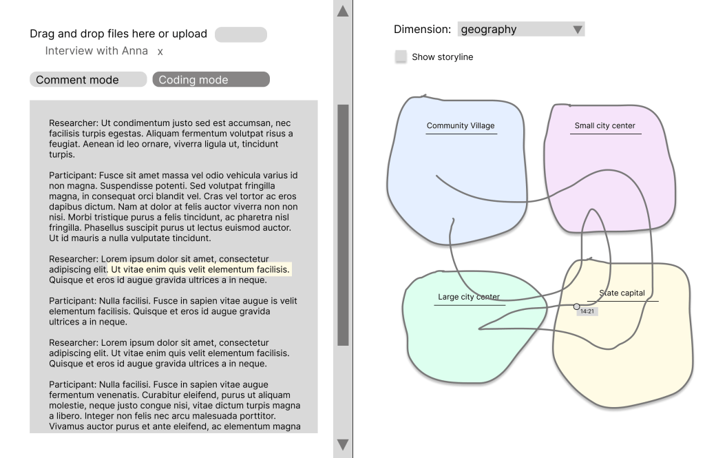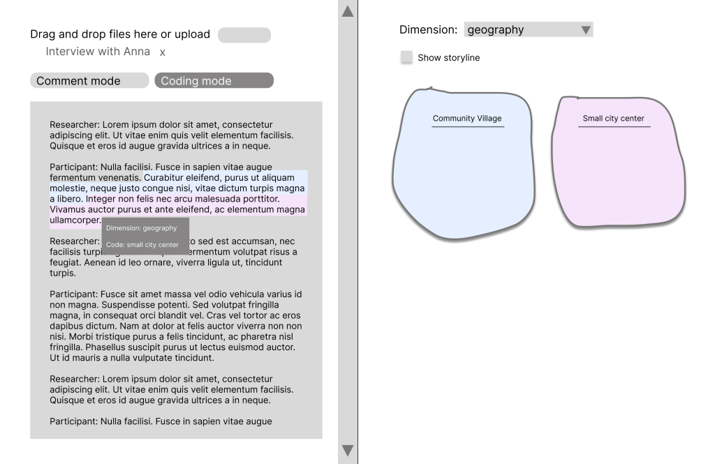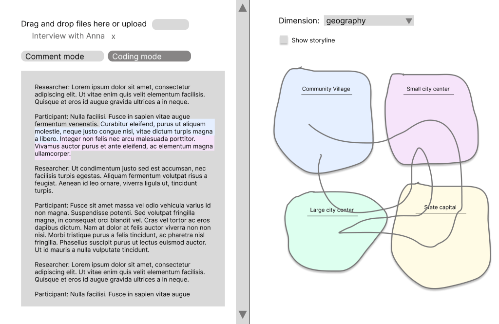 As we analyze the text, we define dimensions and codes. Dimensions are overarching categories like geography, age, or topic. For example, in an interview where a participant discusses experiences in various places, or narratives that span across different stages of life, we can create codes such as “location A”, “location B”, “location C” within the category “locations”.